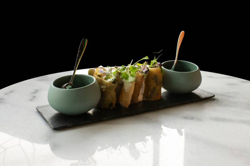 Dünn geschnittene Auberginenstreifen ,kurz angebraten, serviert mit einer feinen Tomatensauce und Knoblauchjoghurt
